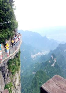 7日早上,我們來到了此行第一站——天門山。天門山海拔1500多米,因自然奇觀天門洞而蜚聲世界,被譽為“湘西第一神山”和“武陵之魂”。我們乘著觀光大巴沿著逶迤曲折的公路盤旋而上,只見壁立千仞,懸崖萬丈,每逢轉彎,車內一片驚呼,盡顯刺激與緊張。下車后,我們繼續前行,當大家爬過999層階梯最終到達巨大的天門洞前時,不禁感嘆大自然的鬼斧神工,神秘玄奇。往下眺望,林木蒼翠,山腳下的湖波像綠寶石一樣鑲嵌其中,美不勝收。清風徐來,令人神清氣爽,視野開闊,豪氣頓生。天門山上的玻璃棧道,依峭壁凌空而建,讓人望而生畏,行而卻步。大家都小心翼翼,體驗雙腳處于萬丈深谷之上的驚險。